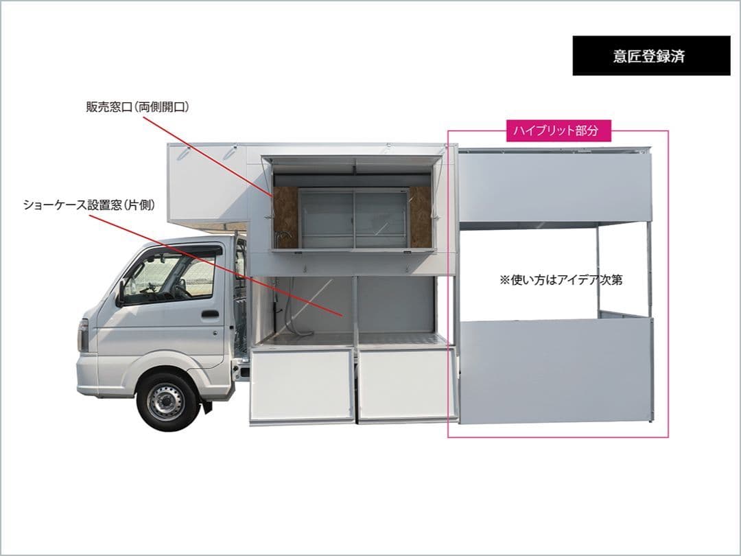キッチンカー(自動車飲食店営業許可)の行政許認可の3型を取得し、車内での仕込み可能、それによって刺身・寿司まで提供可能な万能キッチンカー。さらに後部ハイブリット部分を組み立てれば屋台や着席スタイルのお店も営業可能。これ1台でお店まるごと出張だって可能。また、飲食関連だけの用途ではなく、出張物販の用途、DJブース!?イベントの受付・入場口に!?アイデア次第で様々な使用用途に変化できます。